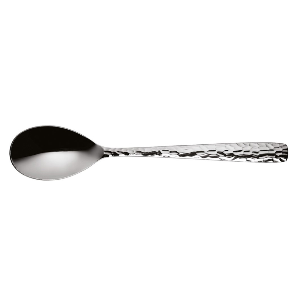 Fabriquée en acier inoxydable, cette cuillère se distingue par sa finition poli miroir à effet martelé, qui capte la lumière et met en valeur votre table avec subtilité. Son design contemporain, à la fois sobre et raffiné, s’adapte aussi bien aux instants du quotidien qu’aux présentations les plus soignées.